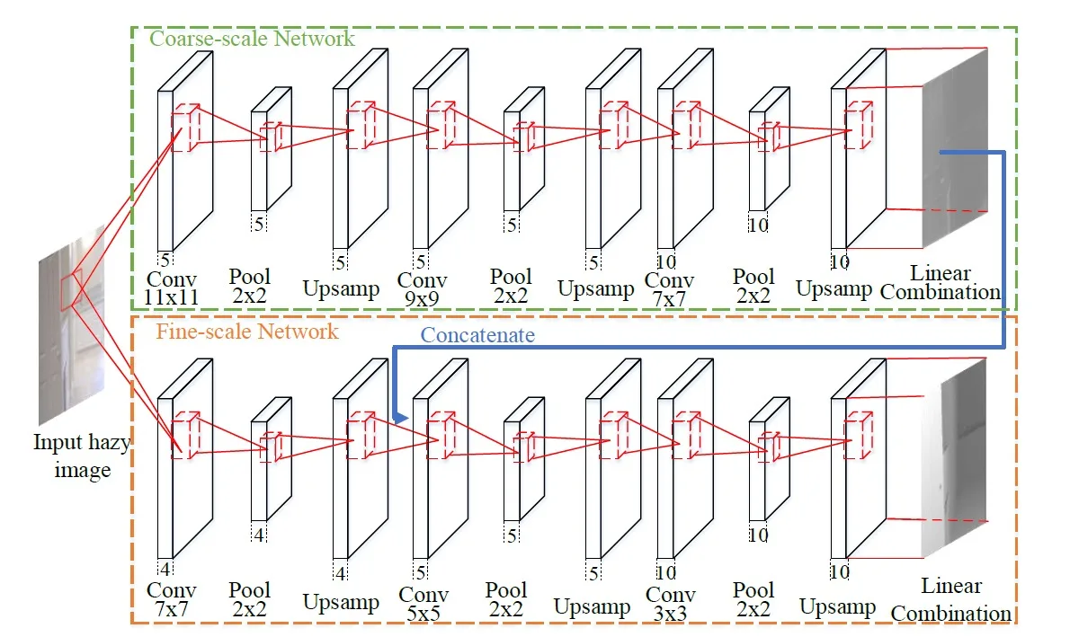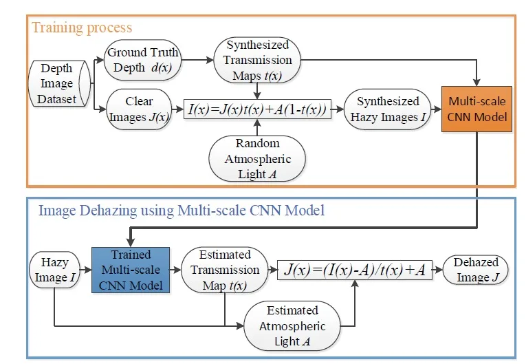 MSCNN,全称:《Single Image Dehazing via Multi-scale Convolutional Neural Networks》,由Ren等人于2016年提出。其思想在于学习雾图与其对应的透射图之间的映射关系,在基于某种算法估计大气光A,最后应用大气散射模型恢复出雾图。(不懂大气散射模型去雾的可参考本系列总结一)