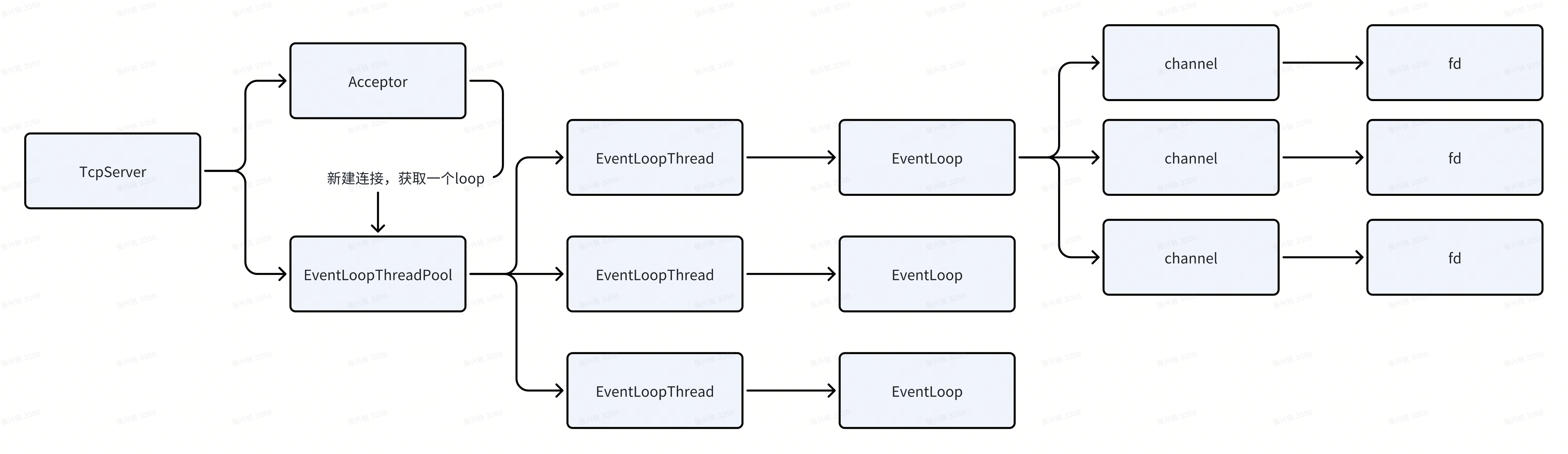 明显muduo是典型的多reactor多线程模型,并遵从主从reactor设计,在主reactor中,只负责建立连接(Acceptor跑在这个reactor上),建立连接后,就从多个子reactor(也就是EventloopThreadPool)中选一个出来处理后续io,之后的处理都在这个线程中。换句话说:建立连接的线程和处理io的线程不在同一个线程。