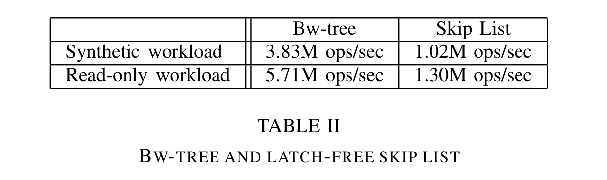 实验结果显示,Bw-Tree相对于传统的B树和无锁的跳列表表现出了显著的优势,特别是在高并发和数据密集型工作loads下。这主要得益于其对缓存的高效利用和latch free。