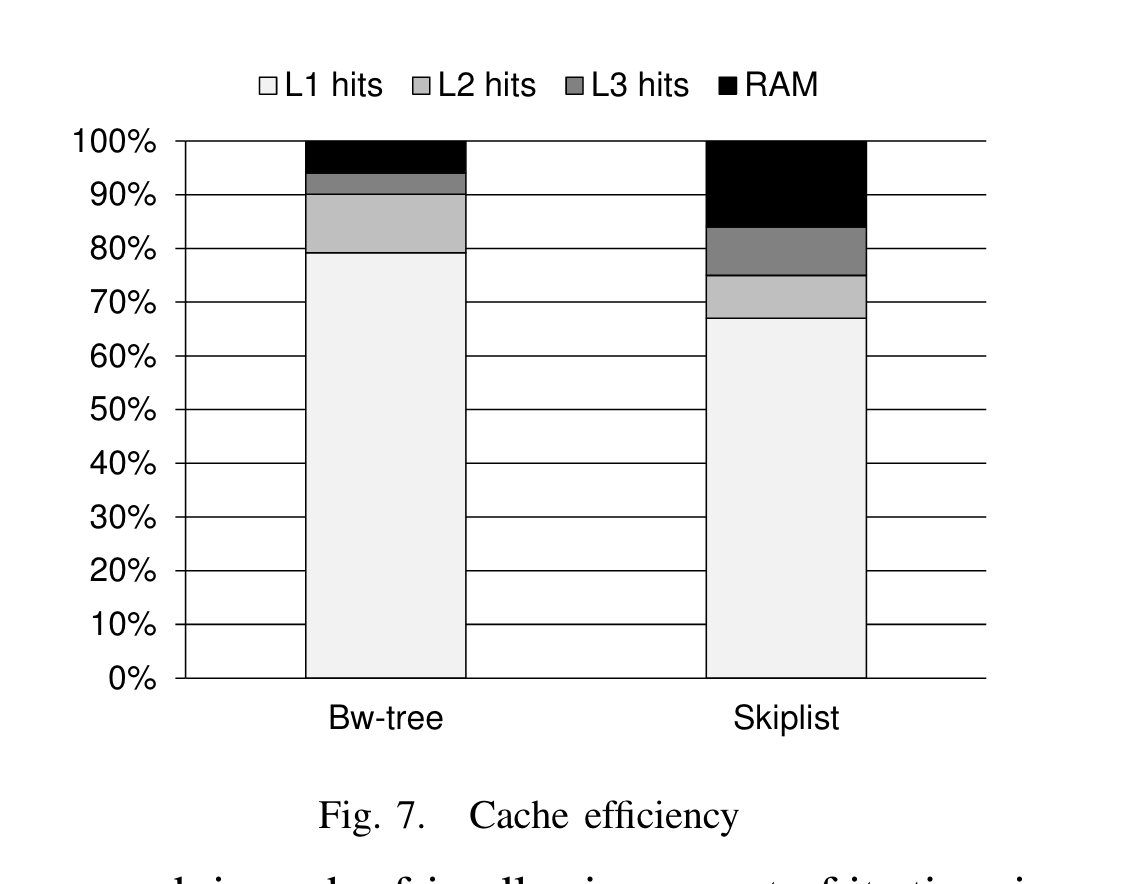 作者分析,BwTree性能优秀的原因来自两方面: 1. latch-free, b tree需要latch,cpu利用率不如bwtree高(btree只有60%的利用率,bwtree则达到99%)。 2. bwtree更cache friendly,因为没有update-in-place。