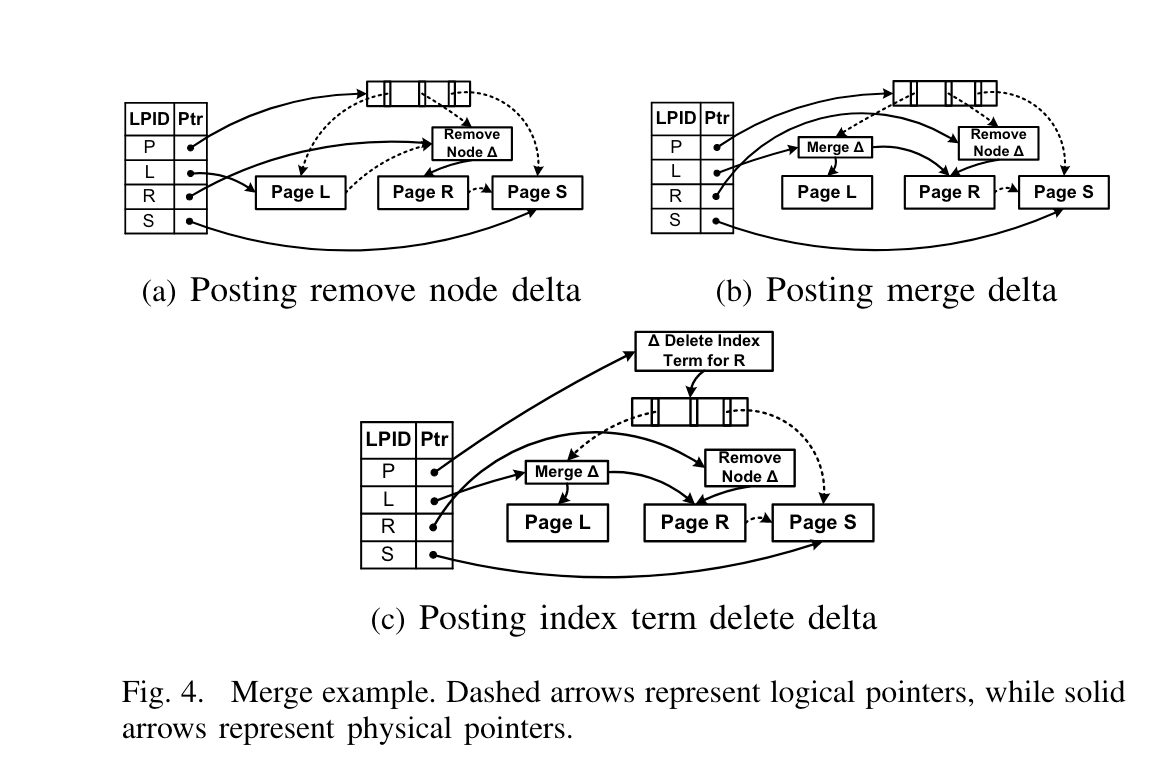 如Fig4(b), Page L增加一个 node merge delta record. 该delta包含一个指向Page R content的指针(也就是说不直接复制Page R的数据)。 当完成这个操作时,即可认为Page R的状态完全转移到Page L(除了remove node delta record),等到consolidate操作时再移除Page R。