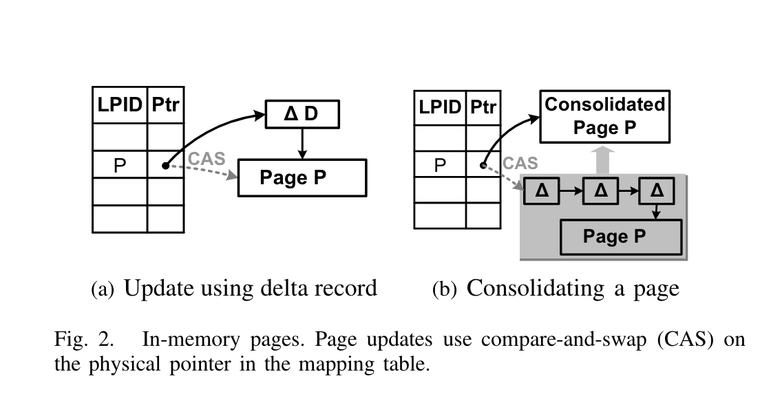 而 delta updates 的方法则不同。它不是直接修改原页面,而是创建一个包含更新内容的 delta 记录,并将这个 delta 记录附加到原页面上。这样,原页面在缓存中的副本仍然有效,不需要失效。只有当需要读取更新后的页面内容时,CPU 才需要将 delta 记录合并到原页面中。这种方式大大减少了缓存失效的次数,提高了缓存命中率 (cache hit ratio),从而提升了性能。