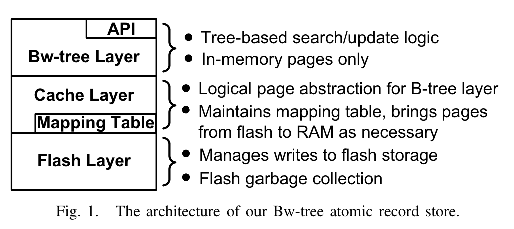 - Cache Layer:中间层,承接上面Bwtree Layer与下面持久化层 Flash Layer