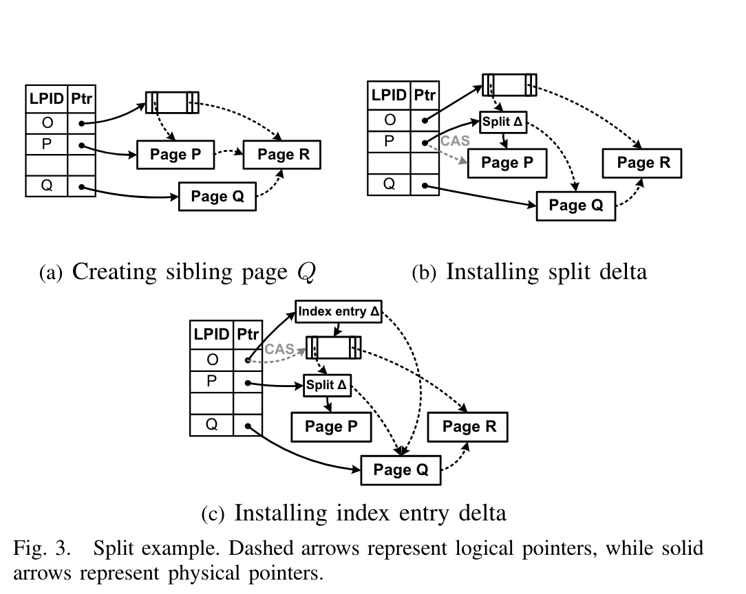 - Fig3(a)先生成Page Q,在Page P中找到合适的分割key K,所有大于Kp的keys都拷贝一份到Page Q(注意这里是Page P的最新状态,也就是这个时候要先做合并操作再split?),接着Page Q的side link指向Page P的右兄弟,也就是Page R。接着install Page Q到mapping table中,这。到这里只有当前的操作线程能看到Page Q,因为Page Q还没有完全install到整个树中。