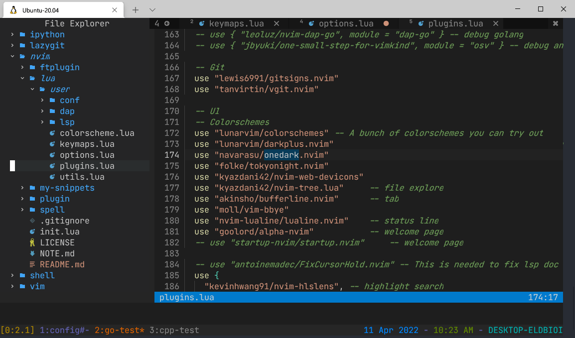 use "hrsh7th/nvim-cmp"-- The completion plugin use "hrsh7th/cmp-buffer"-- buffer completions use "hrsh7th/cmp-path"-- path completions use "hrsh7th/cmp-cmdline"-- cmdline completions use "saadparwaiz1/cmp_luasnip"-- snippet completions use "hrsh7th/cmp-nvim-lsp"-- lsp support use "hrsh7th/cmp-nvim-lua"-- neovim api -- snippets use "L3MON4D3/LuaSnip"--snippet engine use "rafamadriz/friendly-snippets"-- a bunch of snippets to use