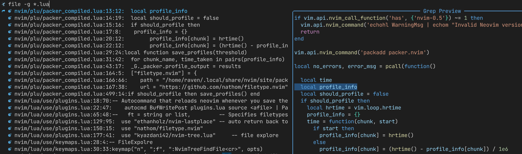 use "kyazdani42/nvim-tree.lua"-- file explore -- Telescope use "nvim-telescope/telescope.nvim" use { "nvim-telescope/telescope-fzf-native.nvim", run = "make", } use "nvim-telescope/telescope-ui-select.nvim" use "nvim-telescope/telescope-live-grep-raw.nvim" use "BurntSushi/ripgrep"-- ripgrep