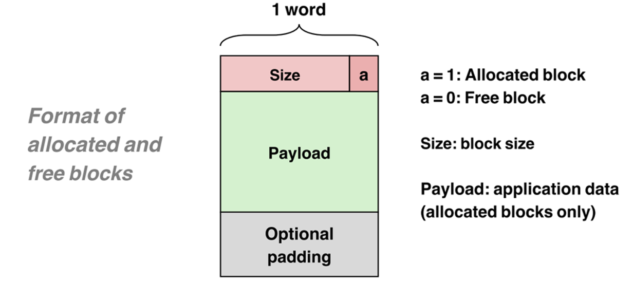 很显然我们需要一些额外的信息来存放block的元信息。之类的具体做法是在block的前面添加一个word,存放分配的size和是否已分配状态。