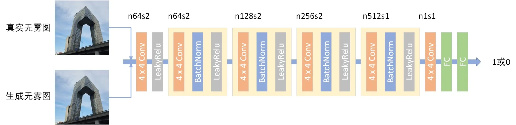 i> 那么这个网络的思想可这样来表达:生成网络G吃一张雾图,吐出一张“假”无雾图,从训练数据集中找到吃掉的雾图的对应“真”无雾图,判别网络D尽自己最大的可能去区分开这“真假”雾图,另一方面,生成网络G尽自己最大的可能去生成接近“真”无雾图的“假”无雾图,用来迷惑判别网络D。两者在这种竞争关系下不断进化,最后达到一种平衡。