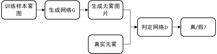 自2014年生成对抗网络(GAN)提出以来,GAN便以一种新式的训练思想逐渐火热。现在已经很多基于GAN的应用,如图像修补,图像风格转换等等。于是自然而然的,笔者采用了GAN来做上图中的去雾网络。