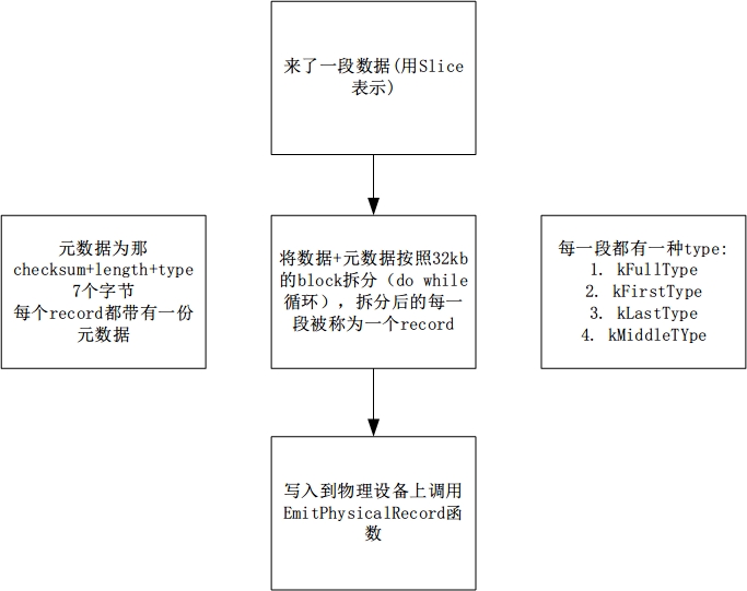 // Fragment the record if necessary and emit it. Note that if slice // is empty, we still want to iterate once to emit a single // zero-length record Status s; bool begin = true; do { constint leftover = kBlockSize - block_offset_; // 当前32kb的块的剩余量 assert(leftover >= 0); if (leftover < kHeaderSize) { // 剩余量 < 一个record的header size // Switch to a new block if (leftover > 0) { // Fill the trailer (literal below relies on kHeaderSize being 7) static_assert(kHeaderSize == 7, ""); dest_->Append(Slice("\x00\x00\x00\x00\x00\x00", leftover)); // 填充本块最后的空间 } block_offset_ = 0; // 更换新块 }