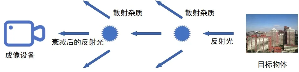 入射光线在目标场景表面发生反射,反射的光线在传播到观测点位置处成像装置的过程中,与悬浮在空中的微粒碰撞发生散射,从图中可以直观的看到有相当一部分的反射光线在发生散射后没有传播到成像装置。这部分传播到其他位置的光线就是入射光的衰减。目标场景所反射光线的衰减程度与观测点位置处成像装置的空间距离有很大关系,空间距离越大,景深也就越深,传播过程中发生散射的机率也越大,相应的光线衰减程度也就越大,最后传播到成像装置的光线会变得很少,所捕获的的图像信息往往模糊不清。