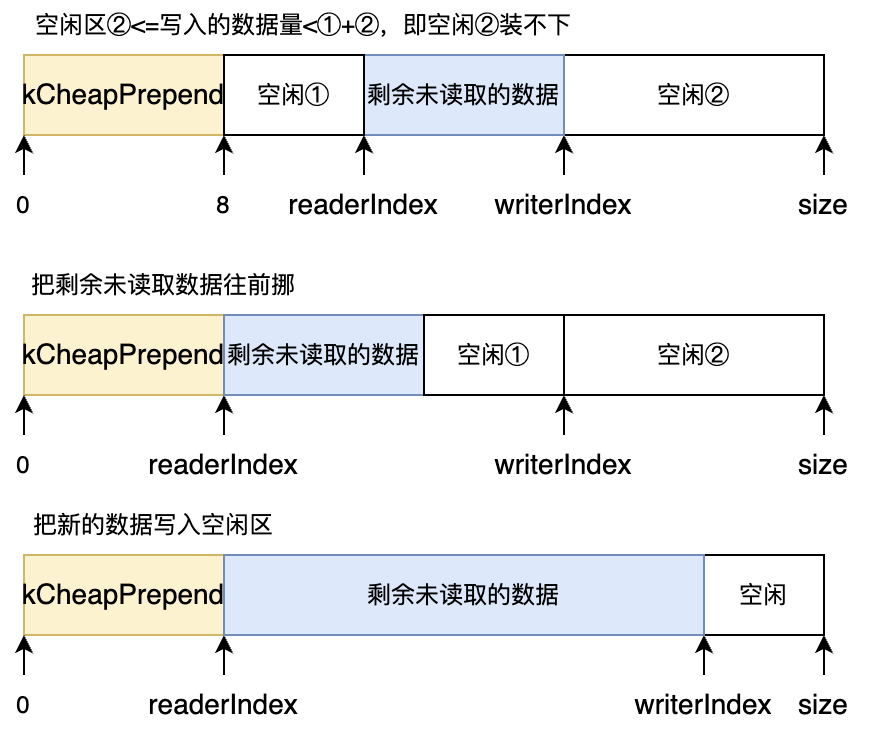 1 2 3 4 5 6 7 8 9 10 11 12 13 14 15 16 17 18 19 20 void makeSpace (size_t len) { if (writableBytes () + prependableBytes () < len + kCheapPrepend) { buffer_.resize (writerIndex_+len); } else { assert (kCheapPrepend < readerIndex_); size_t readable = readableBytes (); std::copy (begin ()+readerIndex_, begin ()+writerIndex_, begin ()+kCheapPrepend); readerIndex_ = kCheapPrepend; writerIndex_ = readerIndex_ + readable; assert (readable == readableBytes ()); } }