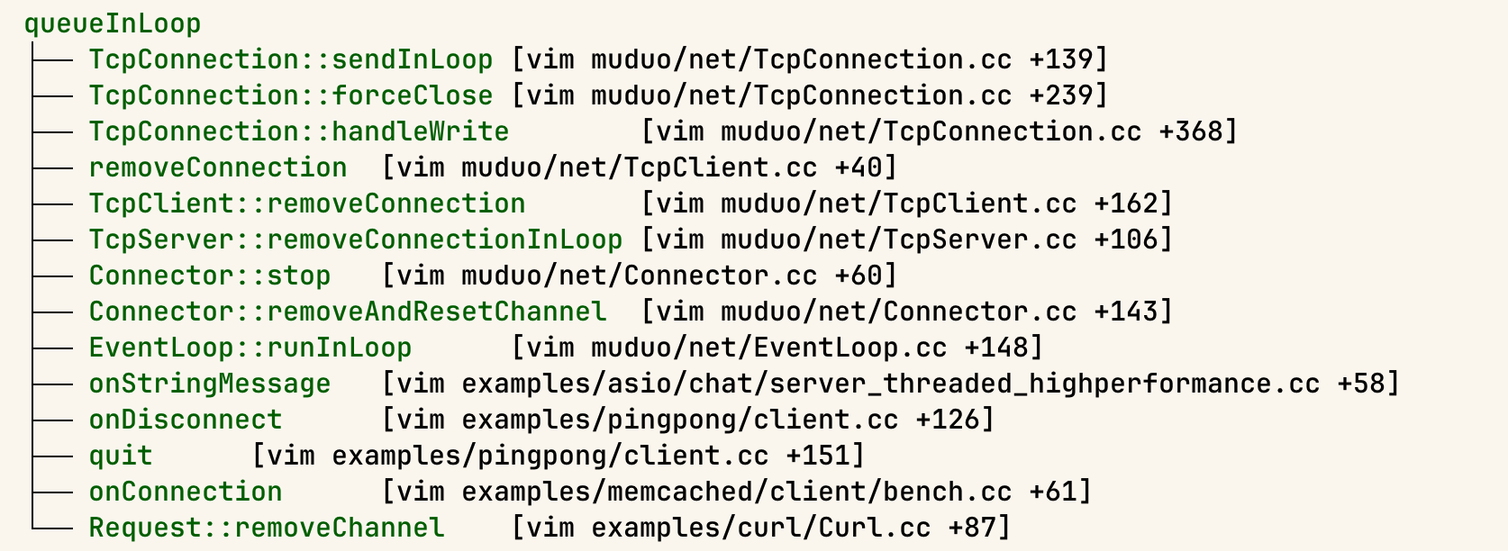 除了poller返回的channel外,事件循环还可以执行其他任务,这些任务都都放到doPendingFunctors中, 这些任务通过 queueInLoop 函数注册,调用点包括: