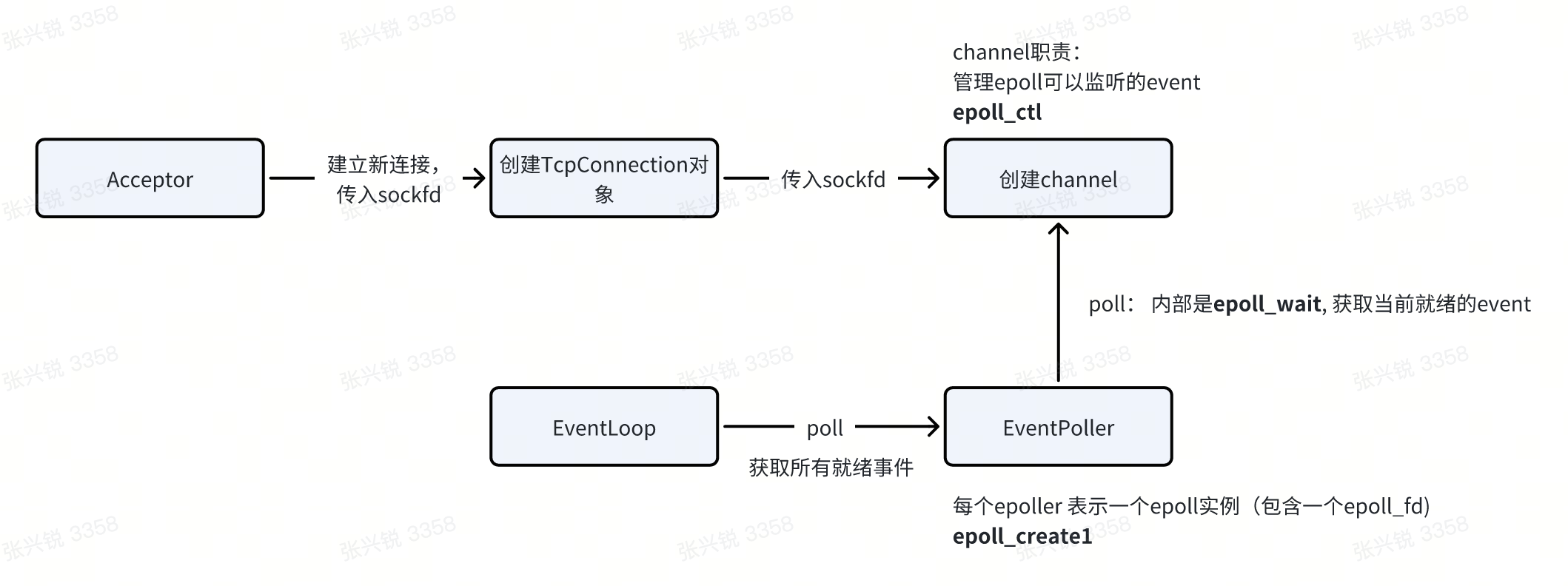 看到Acceptor了,Acceptor用于新建socket链接,将得到的sockfd传入到connection,connection绑定channel。