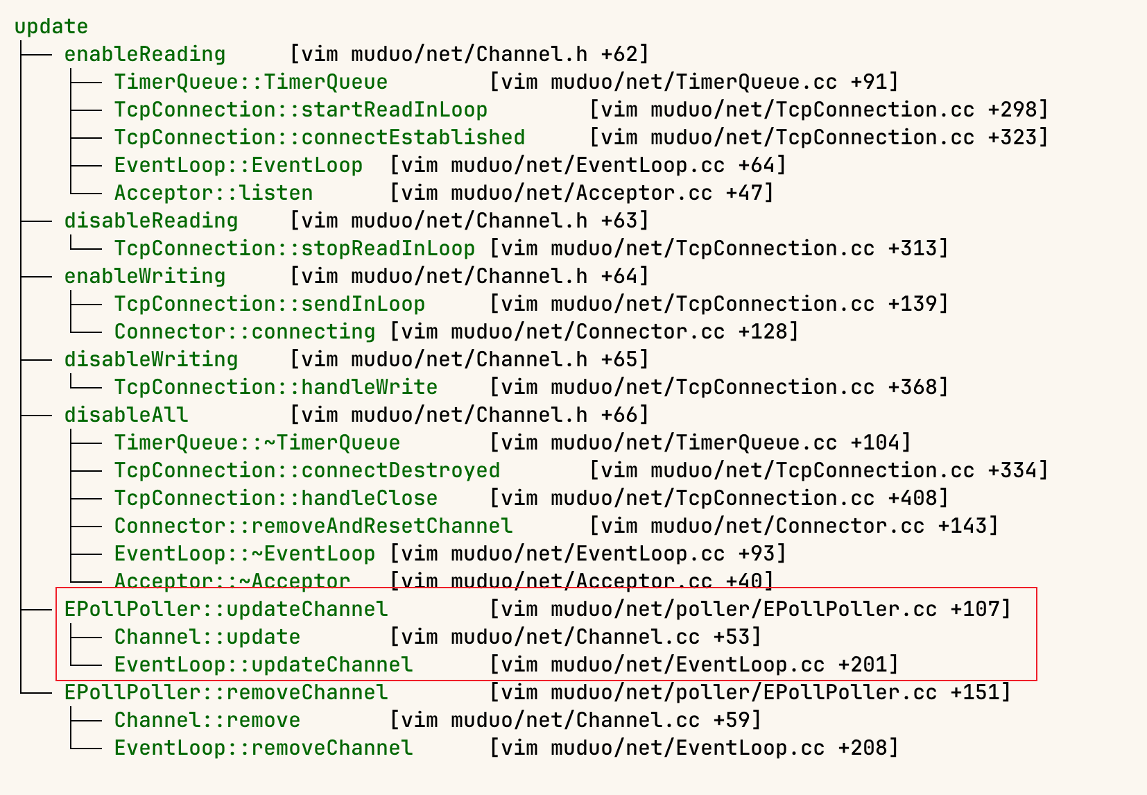 发现调用是通过EPollPoller::updateChannel, 再通过 Channel::update调用进来的。Channel::update的分析见下文:设置可监听类型。